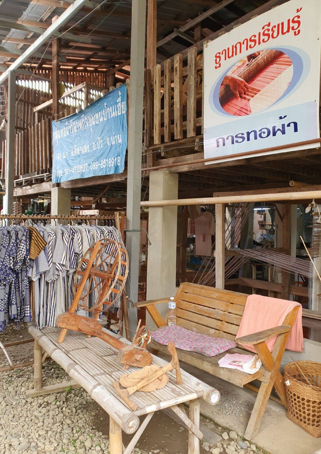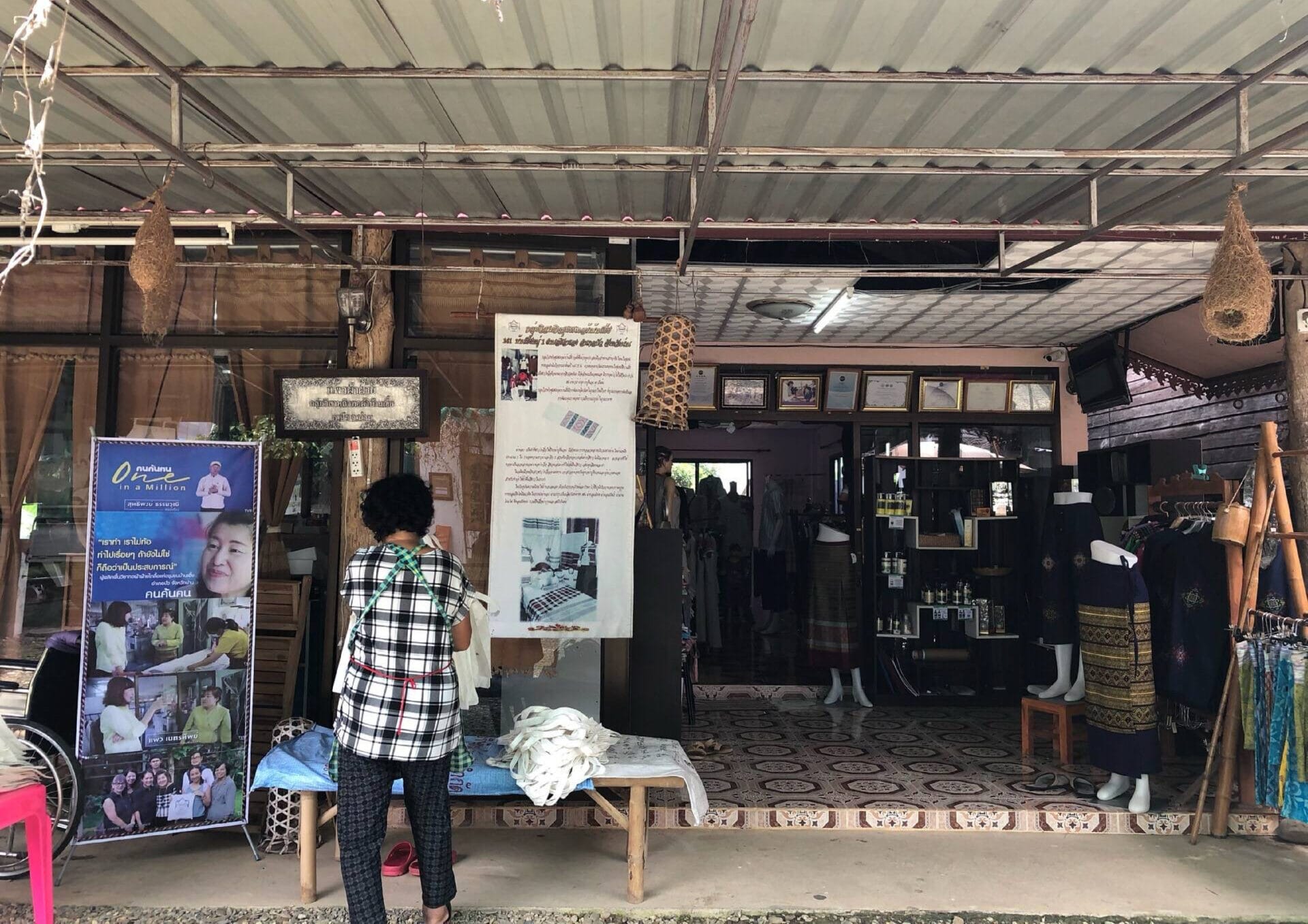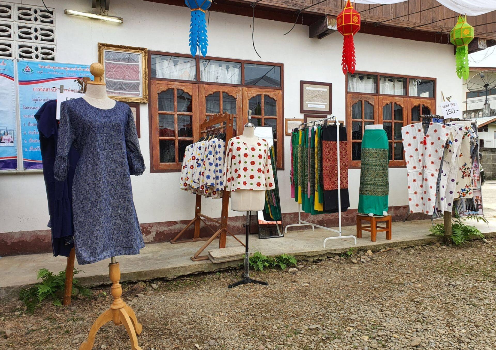 The group’s highlight is that they do everything themselves, from start to finish. Their signature pattern is the Pha Lop pattern, which is a Tai Lue bed sheet pattern. It’s adapted from the original pattern by changing the fibers and rearranging the colors. They design the pattern before weaving it. They design it first, think of the pattern themselves, sew it, and conduct market testing before actually marketing it. They have two product groups: the organic group (20%) and the non-organic group (80%).