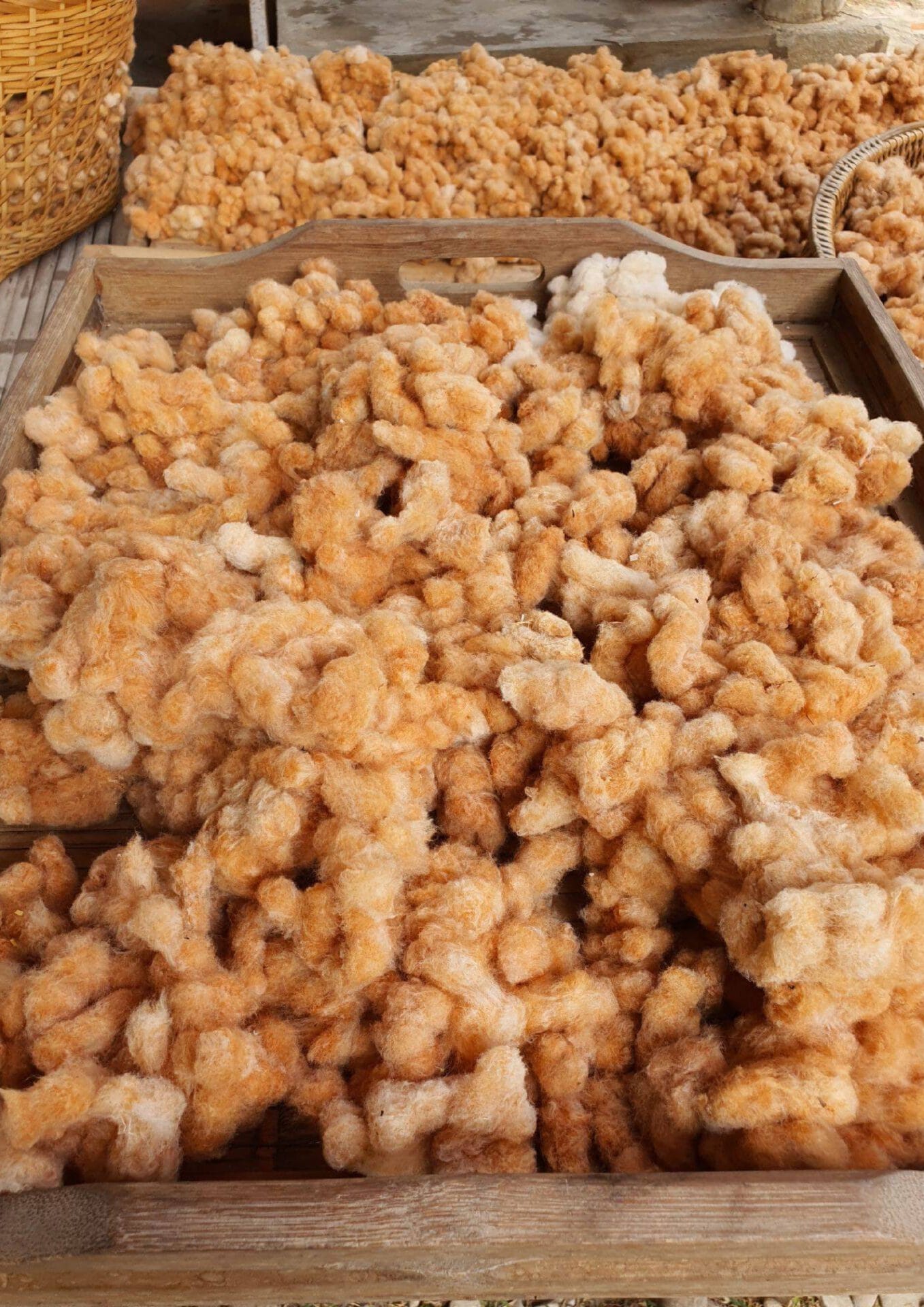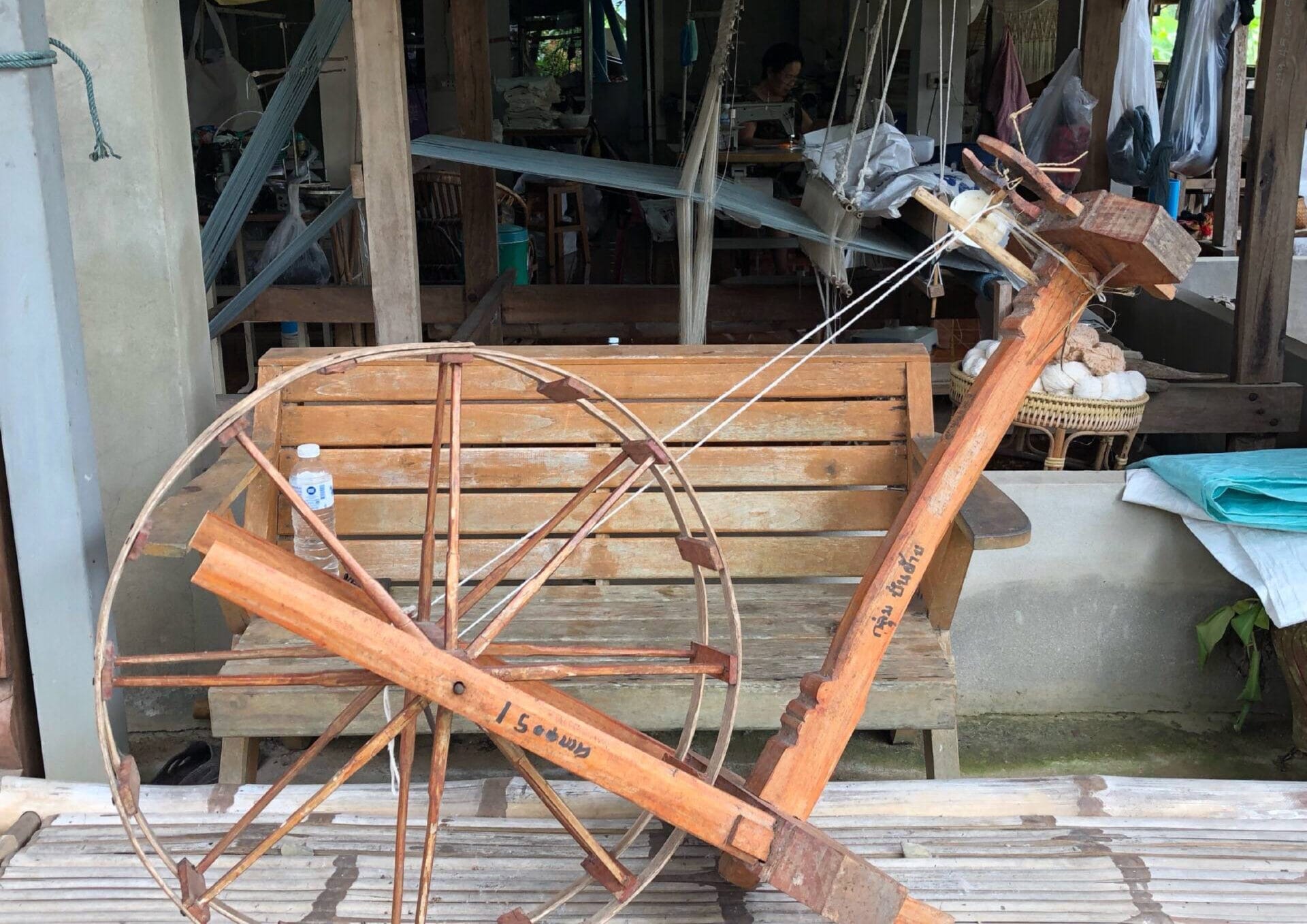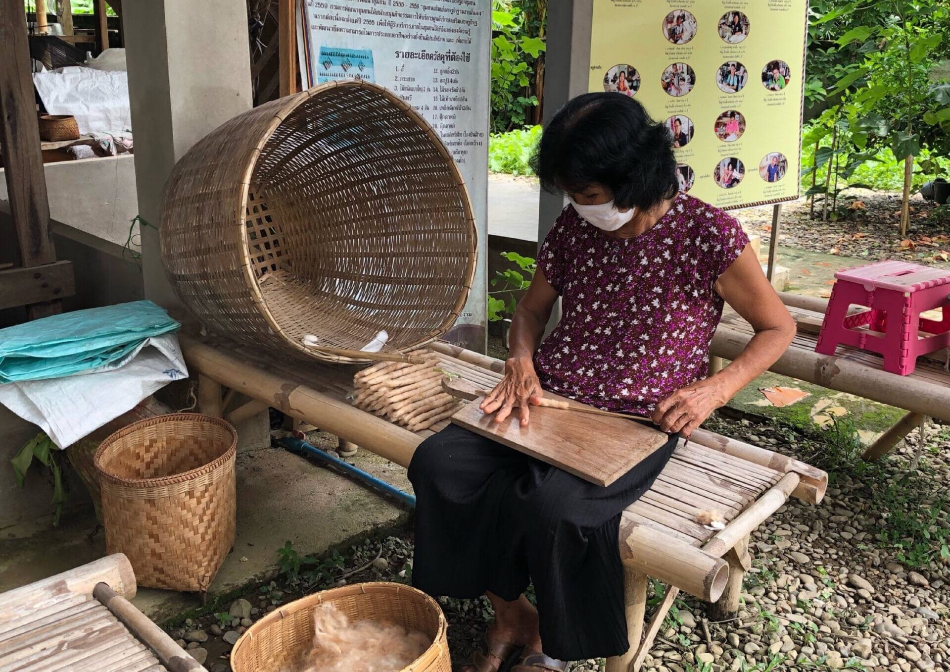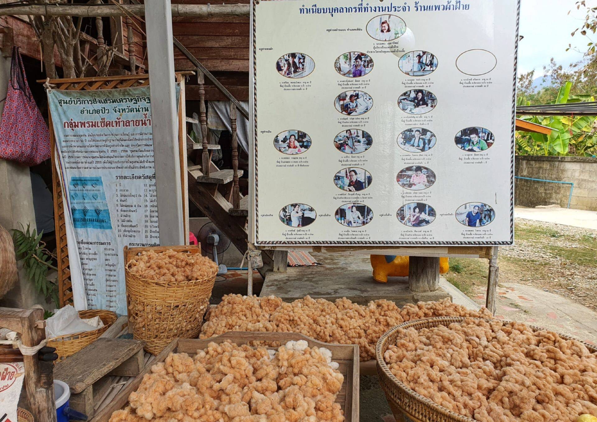 The group’s highlight is that they do everything themselves, from start to finish. Their signature pattern is the Pha Lop pattern, which is a Tai Lue bed sheet pattern. It’s adapted from the original pattern by changing the fibers and rearranging the colors. They design the pattern before weaving it. They design it first, think of the pattern themselves, sew it, and conduct market testing before actually marketing it. They have two product groups: the organic group (20%) and the non-organic group (80%).